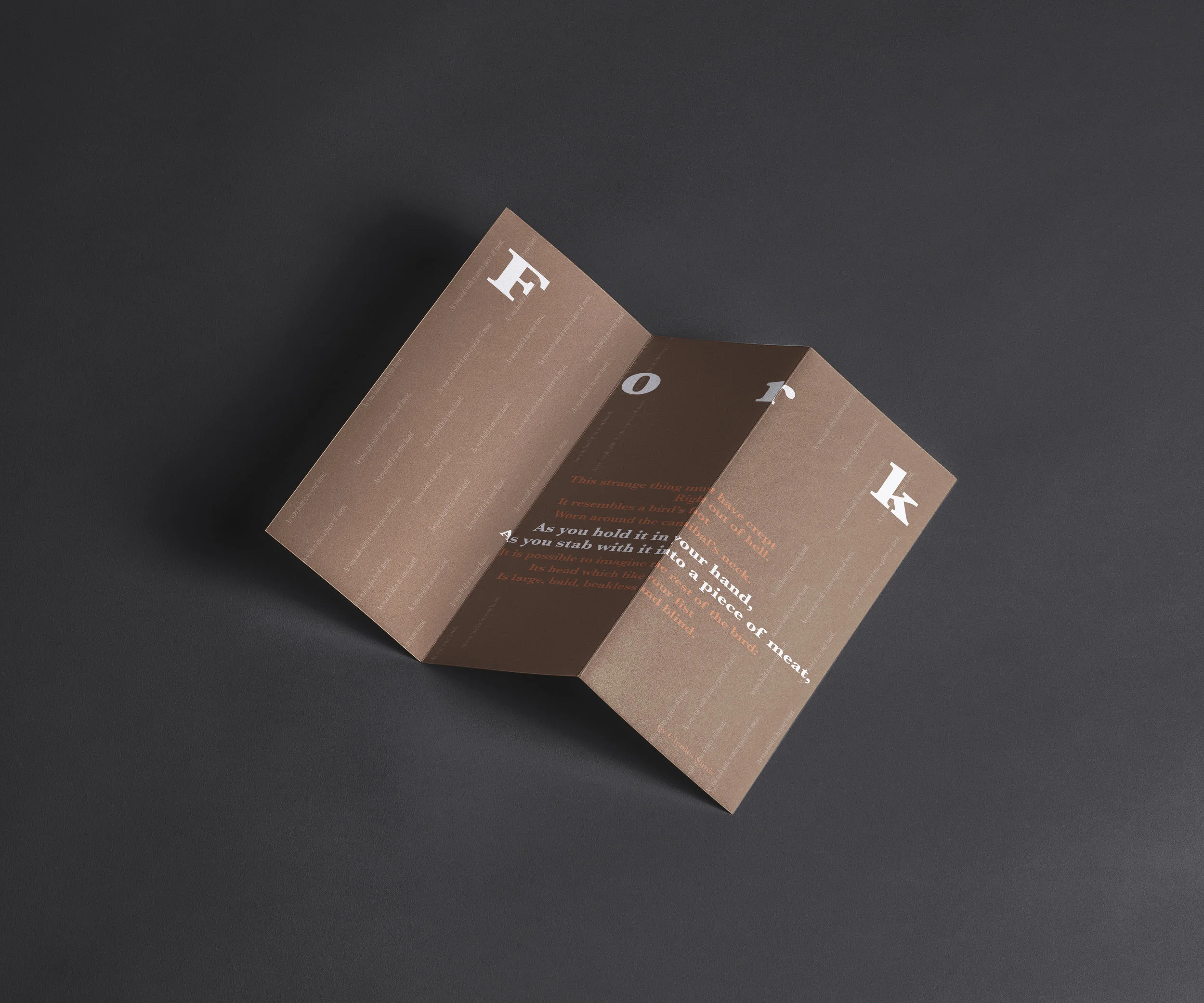 The contents of the bookmarks are from Charles Simic’s Object Poem. The two poems I chose were Fork, and Stone. I designed icons for each poem to provide a snapshot of what to expect. The bookmarks I design have three panels, so they look like mini books. The intention of my design is to provide a quick reading material when people are tired from reading their books. It is like “relaxing from reading but also read to relax.”