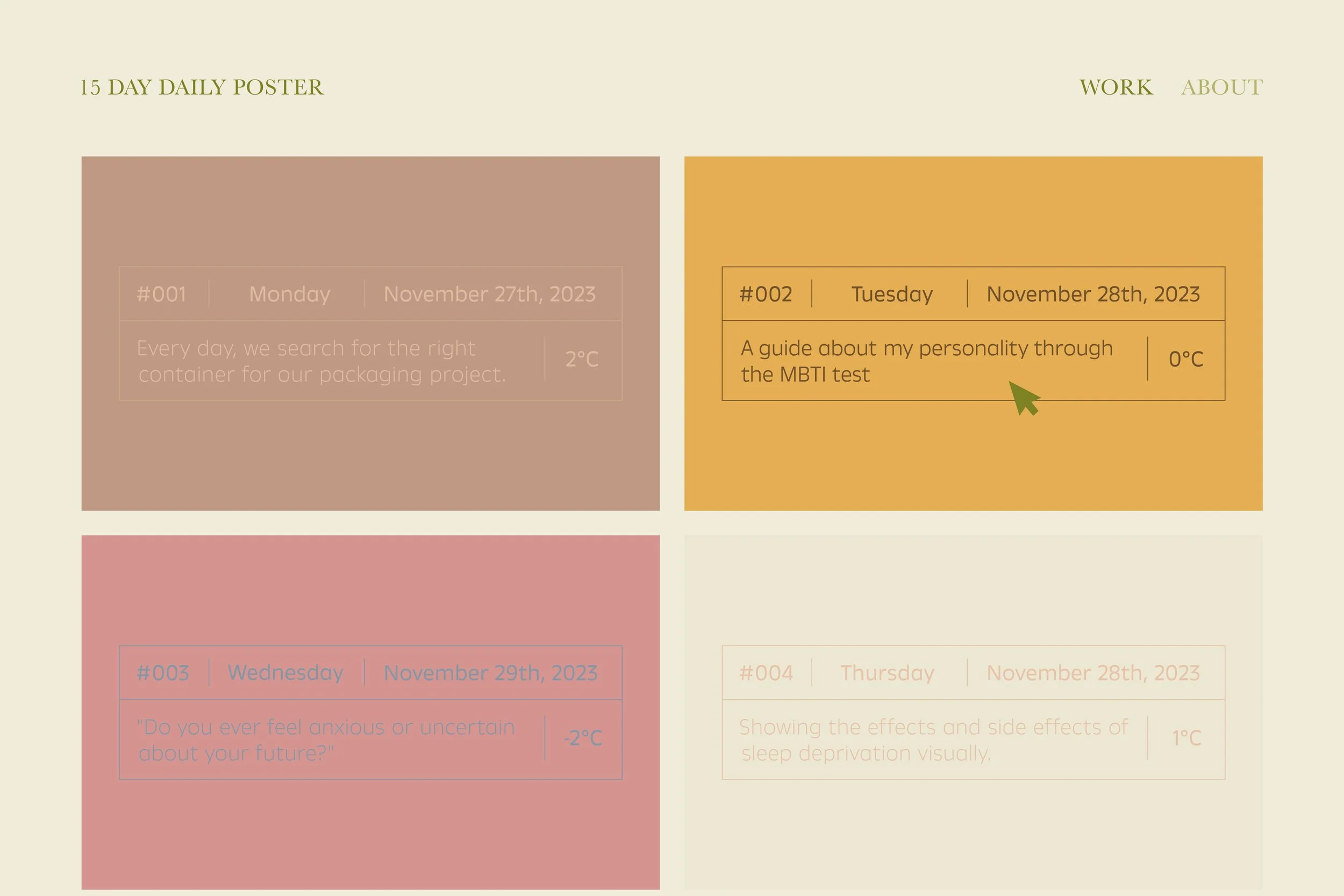 I created a poster every weekday from November 27th to December 15th. The content of these posters is derived from daily inspirations, encompassing my emotions for the day, activities, meals, and more. To add an experimental dimension, I imposed specific limitations on each poster, such as designing within a time frame, using found objects from the street, and creating posters solely for skill acquisition.