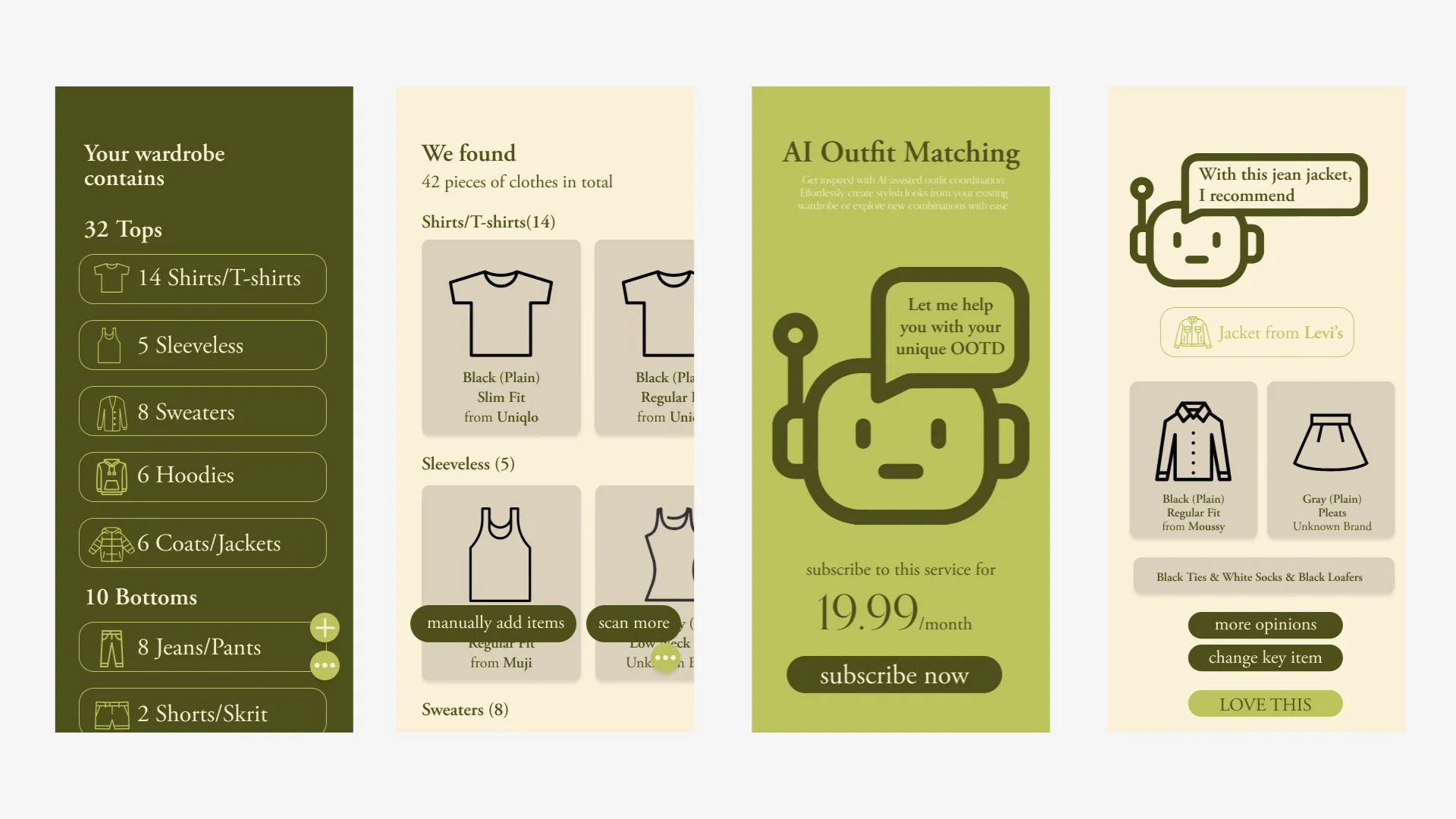 Unified ease, a unique wardrobe inventory system through closet scans powered by AI, we aim to transform the shopping experience. Our subscription service goes beyond personalized notifications to help users curate and organize their existing wardrobe, minimizing unnecessary purchases, with AI assistance for outfit coordination.